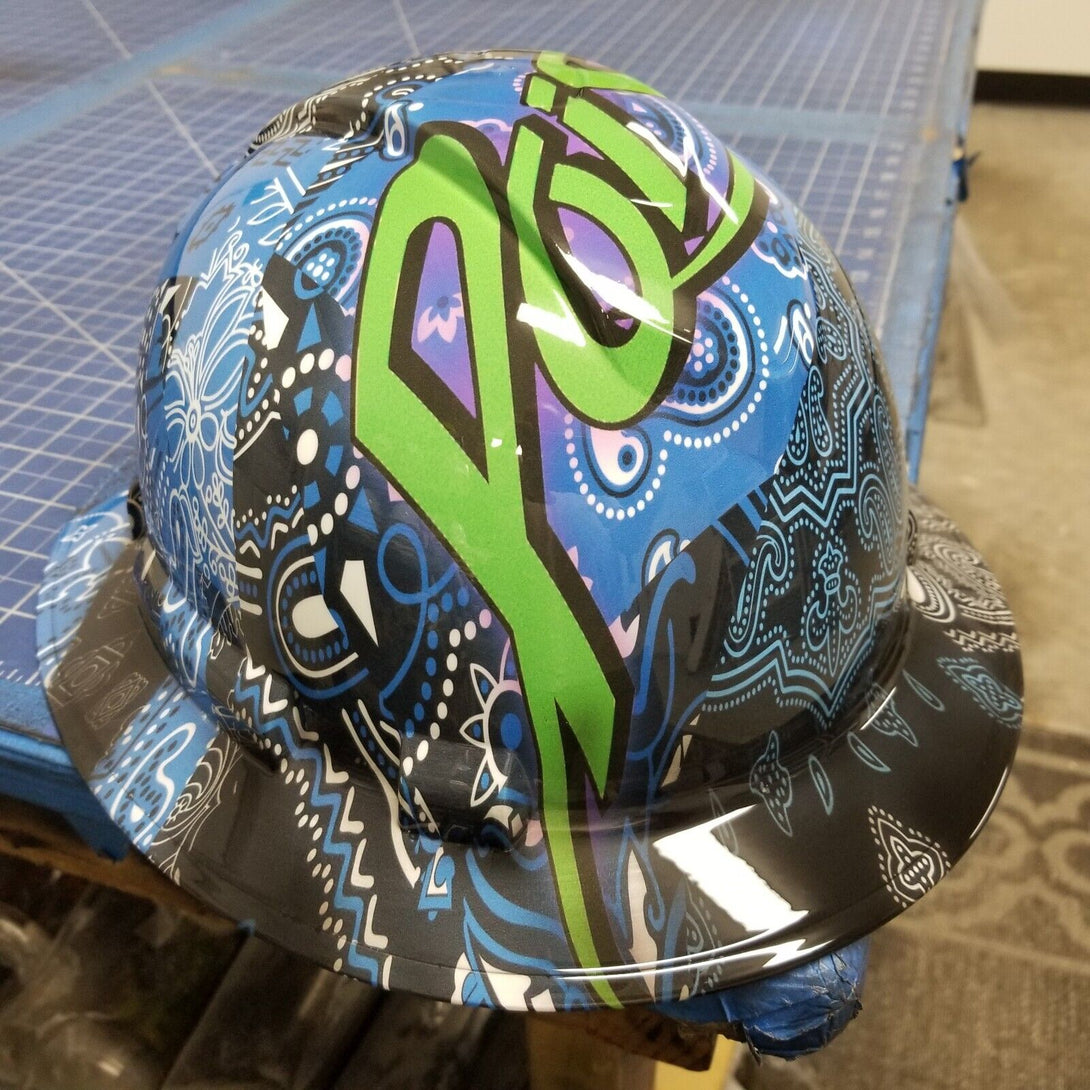 Hydro Blue Bandana w/ Poison Logo Item Description: WET WORKS IMAGING hydro dipped hard hat . That has been custom dipped in house wet works imaging is there only place this hard hat is found , premium printed and then clear coated for that mirror like shine you see in our photos . PLEASE COMPARE OUR SHINE TO THE MORE EXPENSIVE COMPETITION , THERE IS NO COMPARISON , GO COMPARE THEN COME BACK TO THE BEST PRICE , BEST SHINE , BEST HYDRO DIPPED HARD HAT ON THE INTERNET PERIOD . We are the only hydro dippers approved by the manufacturer to dip the Ridgeline hard hat . We meet stringent quality control guidelines that manufacturers demand , so you know you are getting a quality product . All Ridgeline hard hats that we sell are ANSI TYPE 1 CLASS C, G , AND E , OSHA APPROVED , and come with a fully adjustable swing and ratchet head gear that fits hat size 6 3/4 to 8. Padded rear section of head gear is a super nice touch not to mention the super soft replaceable front sweat band., the head gear is also fully adjustable front to back and up and down 2 different positions each and this is one of the lightest hard hats on the market coming in at under a pound WOW!!!!!!! This type of quality fit and finish and don't forget the PRICE . There's only one place to get all this .WET WORKS IMAGING . All of our hard hats comes with free shipping and the piece of mind you are getting the best in our opinion hard hat out there . All images will be as close to photos as possible , please bear in mind that hydro dipped hard hats are like finger prints two will look close but never the same . So yours will be unique to you and only you . All of our Ridgeline hard hats are direct bond to plastic application meaning no chance of the print lifting off of any of our hard hats , the clear coat may scratch but rest assured the print will not come off . WET WORKS IMAGING OFFERING UP TOP QUALITY CUSTOM HARD HATS AT A PRICE THAT CANT BE BEAT !!!!!!!!!