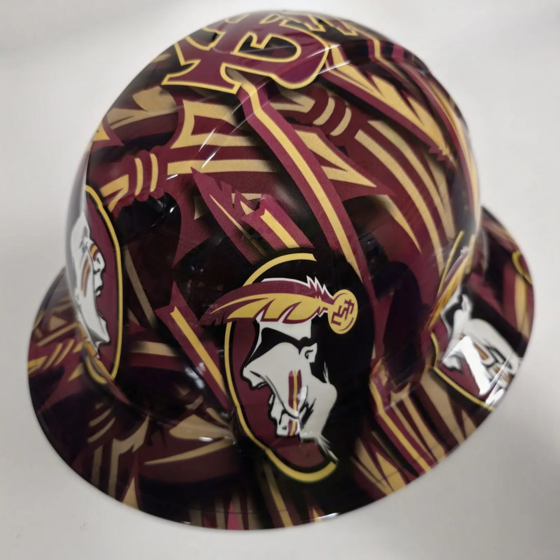 Hydro Florida State Seminoles Football Item Description: WET WORKS IMAGING hydro dipped hard hat . That has been custom dipped in house wet works imaging , premium printed and then clear coated for that mirror like shine you see in our photos . PLEASE IF YOU ARE COMPARING THIS TO OTHERS GO AND ENLARGE PHOTOS TO SEE THE REAL DIFFERENCE PLEASE COMPARE OUR SHINE TO THE MORE EXPENSIVE COMPETITION , THERE IS NO COMPARISON , GO COMPARE THEN COME BACK TO THE BEST PRICE , BEST SHINE , BEST HYDRO DIPPED HARD HAT ON THE INTERNET PERIOD . We are the only hydro dippers approved by the manufacturer to dip the Ridgeline hard hat . We meet stringent quality control guidelines that manufacturers demand , so you know you are getting a quality product . All Ridgeline hard hats that we sell are ANSI TYPE 1 CLASS C, G , AND E , OSHA APPROVED , and come with a fully adjustable swing and ratchet head gear that fits hat size 6 3/4 to 8. Padded rear section of head gear is a super nice touch not to mention the super soft replaceable front sweat band., the head gear is also fully adjustable front to back and up and down 2 different positions each and this is one of the lightest hard hats on the market coming in at under a pound WOW!!!!!!! This type of quality fit and finish and don't forget the PRICE . There's only one place to get all this .WET WORKS IMAGING . All of our hard hats comes with free shipping and the piece of mind you are getting the best in our opinion hard hat out there . All images will be as close to photos as possible , please bear in mind that hydro dipped hard hats are like finger prints two will look close but never the same . So yours will be unique to you and only you . All of our Ridgeline hard hats are direct bond to plastic application meaning no chance of the print lifting off of any of our hard hats , the clear coat may scratch but rest assured the print will not come off . WET WORKS IMAGING OFFERING UP TOP QUALITY CUSTOM HARD HATS AT A PRICE THAT CANT BE BEAT !!!!!!!!!