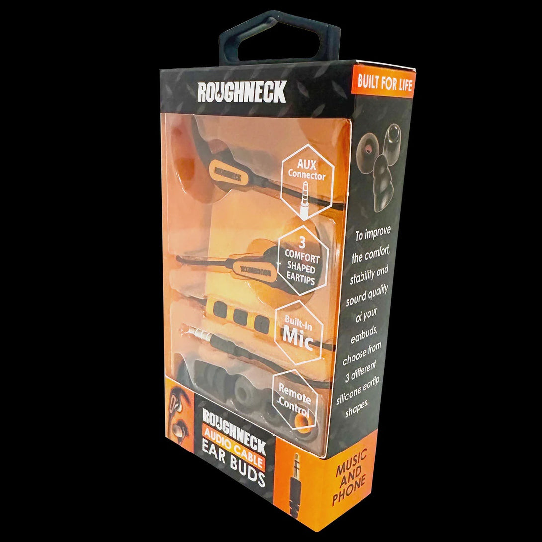 Enjoy superior sound quality and comfort with these Roughneck Wired Earbuds! It has a built-in MIC/remote control, 3 comfort shaped silicone eartips, and an AUX connector for clear sound with deep bass.