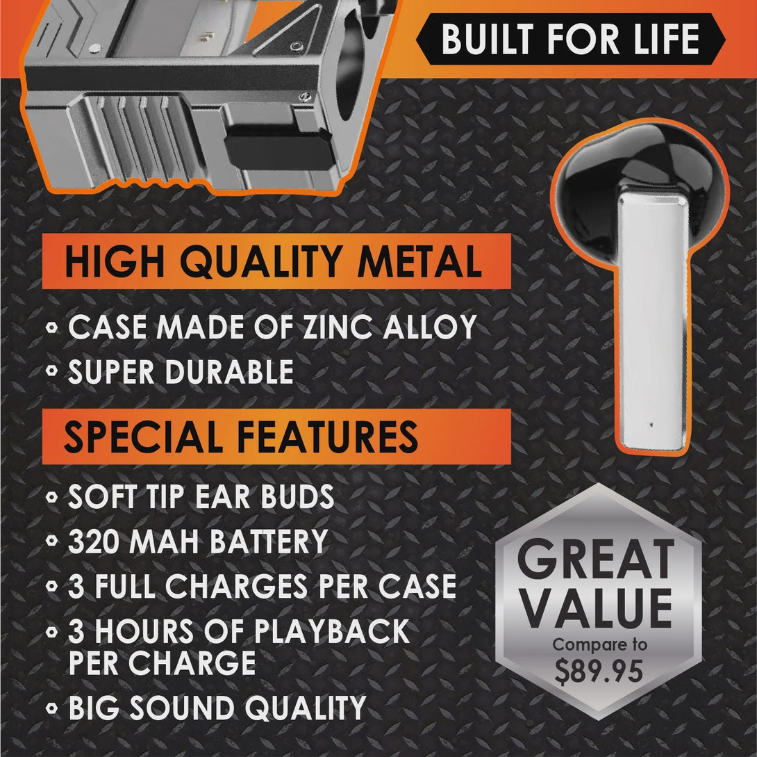 Never settle for mediocre sound - step up your music game with these metal Wireless Earbuds. Get up to 3 hours of play time and an impressive 3 FULL charges per case, so you can rock on and keep ALL the energy. Keep the party going with the included charging case and cable. Rugged and reliable, you can take your music anywhere.