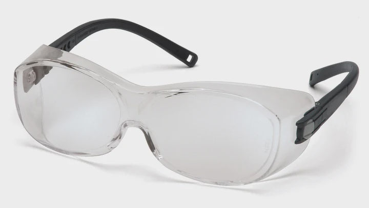 Pyramex OTS Clear Lens with Black Temples Designed to better fit today's prescription eye wear. Lightweight nylon temples adjust for length and pitch. Single lens encapsulates the eye for superb protection. Scratch resistant polycarbonate lens provides 99% UVA/B/C protection. Fits over frames up to 5 3/8" W x 1 3/4" H | 137mm x 44mm Lens Technology Clear Lens: General purposes for indoor applications that require impact protection. Visible Light Transmitted 380-780nm 96% UVA, UVB Blocked 200-380nm 100% Blue Light Blocked 400-700nm 9% IR Blocked 780-2000nm 18%